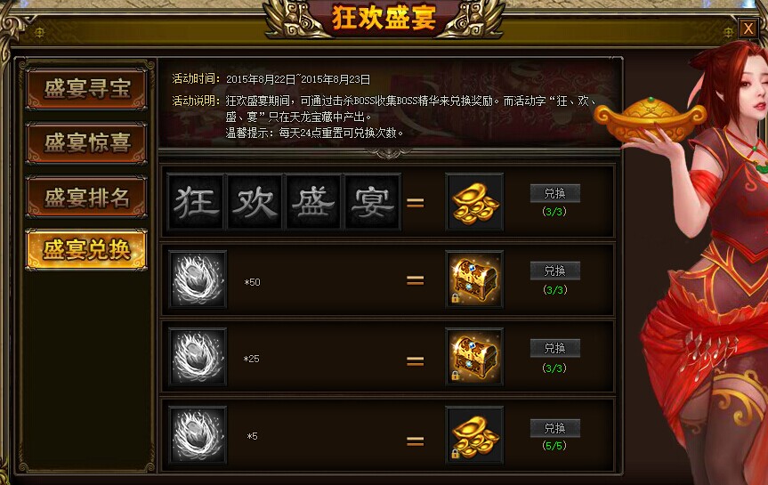 活动内容: 狂欢盛宴期间,可通过击杀BOSS收集BOSS精华来兑换奖励!而活动字“狂”、“欢”、“盛”、“宴”只在天龙宝藏中产出,每天可兑换次数24点重置!