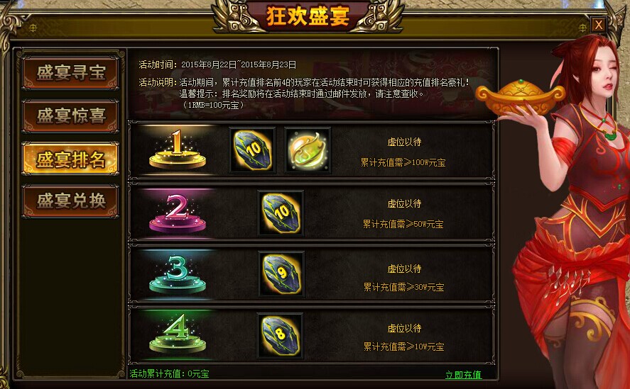 活动内容:活动期间,累积充值排名前4的玩家在活动结束时可获得相应的充值排名豪礼!活动奖励将在活动结束后通过邮件发放,请注意查收!