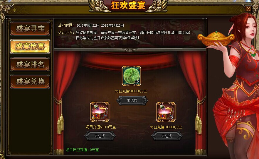 活动内容: 狂欢盛宴期间,每天充值一定数量元宝,即可领取百炼黑铁礼盒回馈奖励!开启百炼黑铁礼盒将随机获得7~9级黑铁之一!每日充值达到5W元宝和10W元宝可分别领取1个和2个百炼精钢礼盒,每日充值达到20W元宝还可额外领取璞玉*10