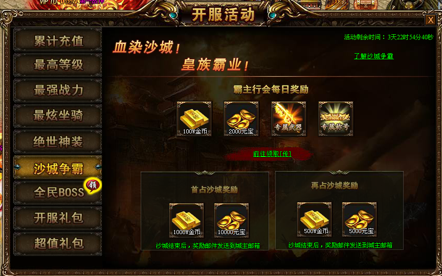 首占沙城奖励:非绑定元宝*10000、非绑定金币*1000W