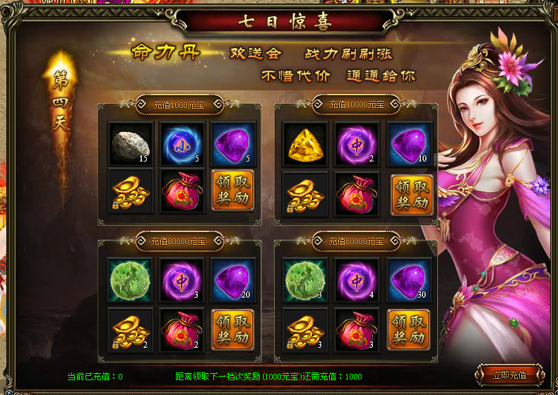 【活动内容】:开服活动期间,每天充值元宝数额达到1000、10000、30000、50000元宝时,分别可领取一份丰富的奖励,每天的奖励内容都不同哦!