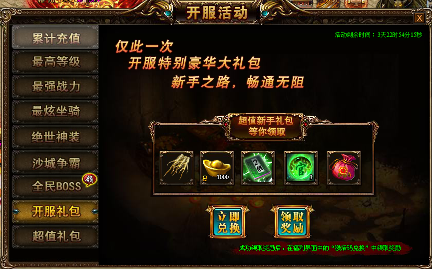 荣誉令牌(中)*1、精炼符文(30%)*1、超级攻击药水*2、绑定金币*100W |