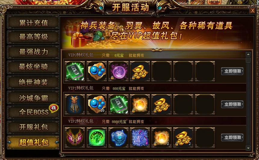 【活动内容】:,VIP0~VIP10均分别可领取一次VIP特权礼包,VIP1级以上礼包需花费元宝领取,超低折扣价!