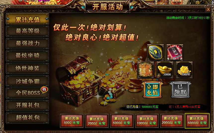 【活动内容】:开服后,累计充值达到奖励领取条件即可领取对应礼包,活动期间累计充值50W元宝,则可领取全部的开服活动奖励内容