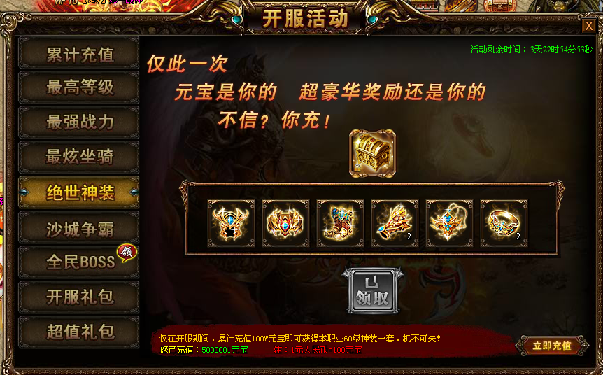 【活动内容】:活动期间,累计充值100W元宝即可获得本职业60级神装一套!机不可失!