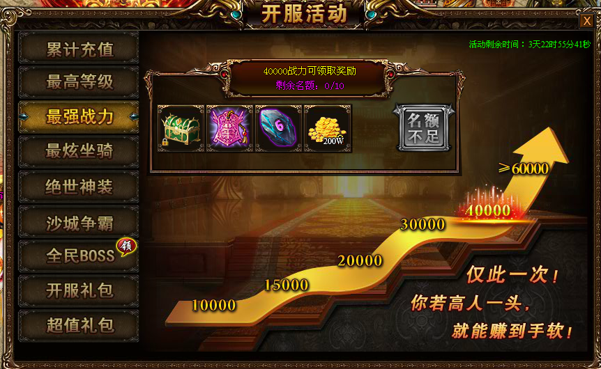 【活动内容】:开服后,率先达到设定战力值目标的玩家即可领取丰厚奖励,先到先得,名额有限哦!活动结束时,全服第一战力且战力大于60000的玩家还可以获得九耀装备箱及丰富道具奖励!