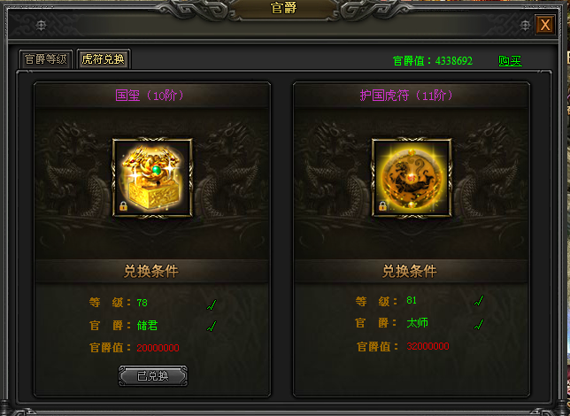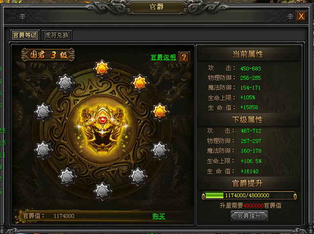 新增11级官爵等级—太师,官爵等级上限升级为太师10级,此外还新增11级官印—护国虎符(11阶)