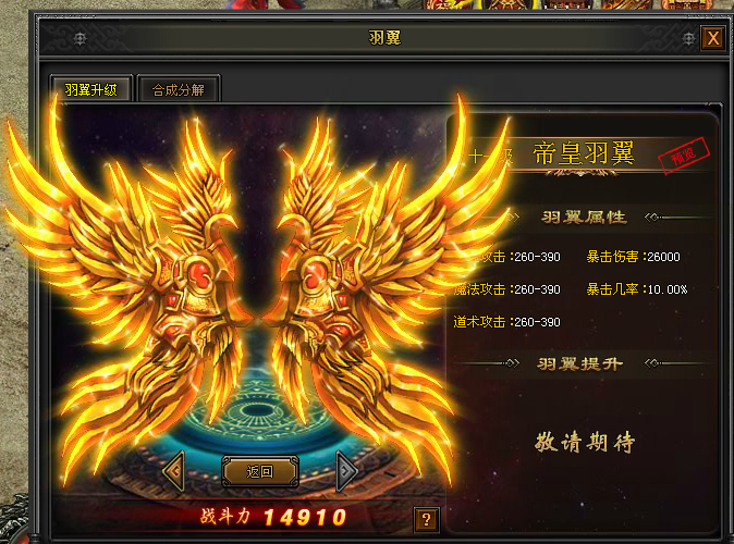 新版本中新增十一级羽翼—帝皇羽翼!十一级羽翼可通过2个十一级羽毛合成获得!可为角色增加大量属性!