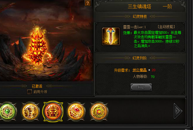 此外传说幻灵也将开启更高等级,万华圣器及三生镇魂塔幻灵使用地炎魔晶可升级!多余的传说幻灵可在土城NPC—珍宝兑换处兑换为魔晶礼包等