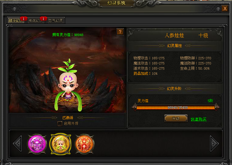 开放幻灵等级上限至10级十阶,使用灵力值可升级幻灵等级,极致属性!值得追求!
