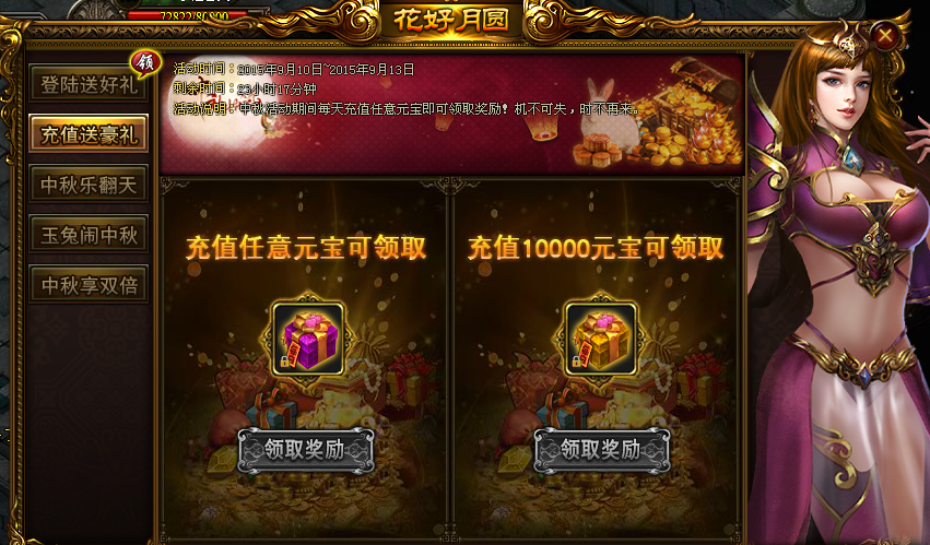 【活动内容】:活动期间,每天充值任意金额以及充值金额达到10000元宝时可分别领取1份丰厚奖励!每天可领取的礼包内容还不一样哦!