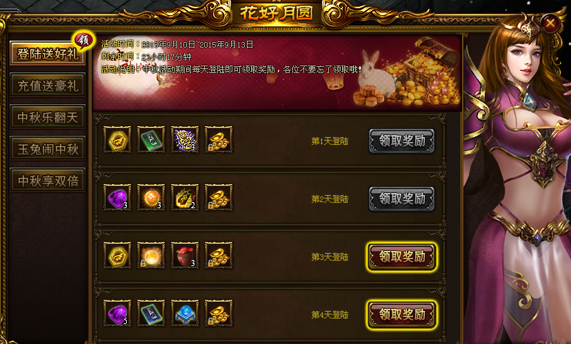 【活动内容】:中秋活动期间,每天登陆即可领取丰厚奖励1份哦!