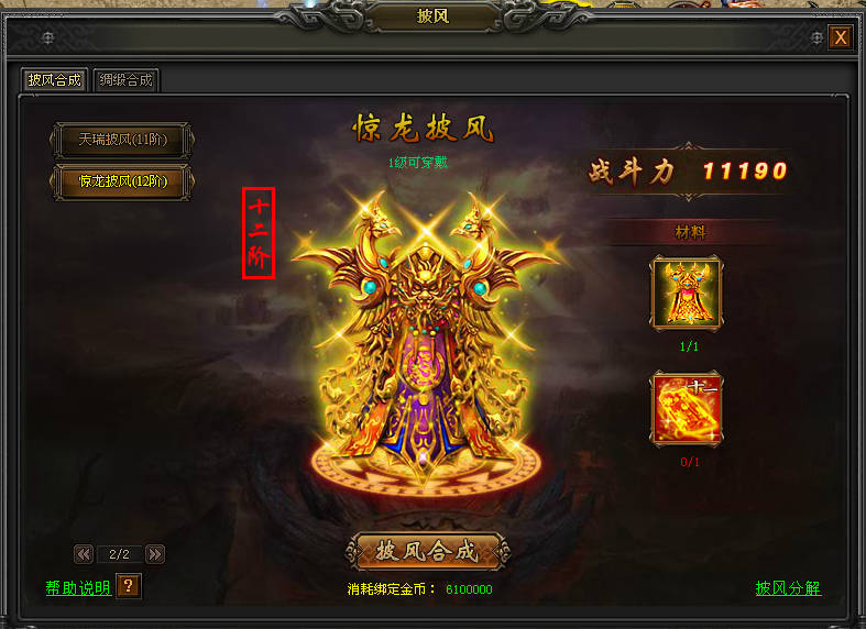新版本中12级披风—惊龙披风,12级披风可由11级披风以及1个十一级绸缎合成获得,2个十级绸缎可合成1个十一级绸缎。