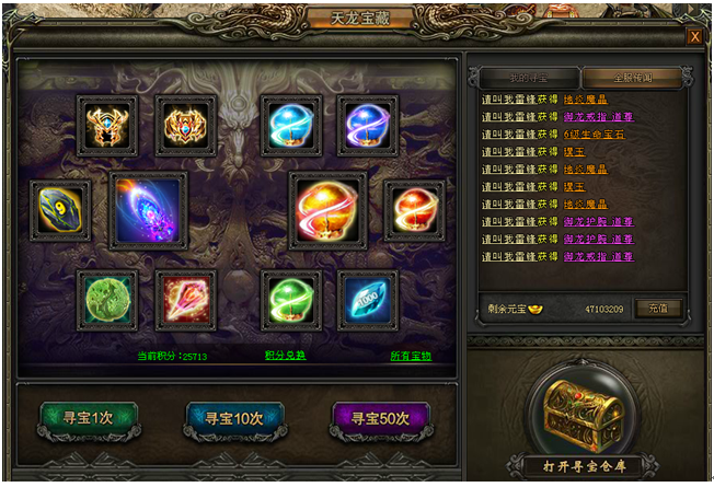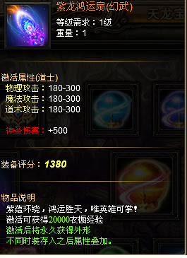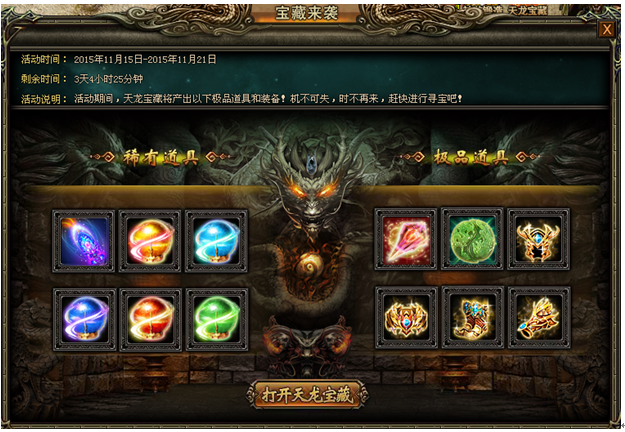 活动内容:活动期间,天龙宝藏中将产出紫龙鸿运扇(幻武)、9级宝石等各种珍稀道具!机不可失!