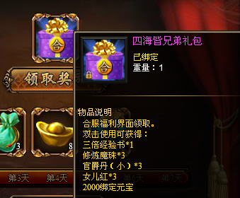 四海皆兄弟礼包:三倍经验书*1、修炼魔珠*3、官爵丹(小)*3、女儿红*3、绑定元宝*2000