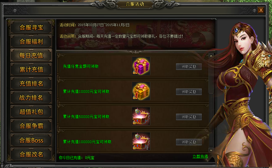 【活动内容】:活动期间,每天充值任意金额即可领取丰厚礼包一份,每日充值金额达到10000、50000、100000、200000时还可分别领取合服精美礼包、百炼黑铁礼盒以及超级黑铁礼盒的珍稀道具!