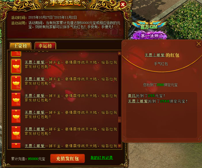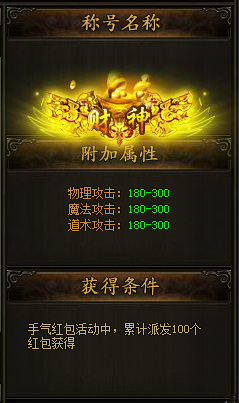 【活动内容】活动期间,当有玩家累计充值达到50000元宝或相应倍数的元宝,则所有玩家都可以拼手气抢红包!有几率获得非绑定元宝哦!手快有,手慢无!累计派发100个红包可获得财神称号!