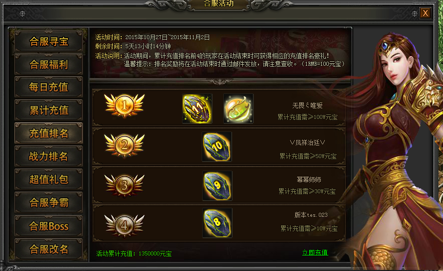 活动期间累计充值排名第4且充值金额≥10W元宝 |