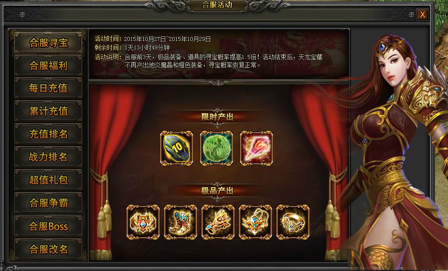 【活动内容】:合服前三天,极品装备、道具的寻宝概率提高1.5倍!活动期间天龙宝藏寻宝还将产出地炎魔晶、璞玉、10铁以及橙色装备,活动结束后寻宝概率恢复正常!