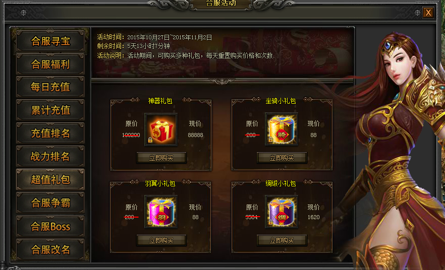 【活动内容】:超值礼包只在合服期间出售!每天重置购买次数和价格!超值优惠折扣!