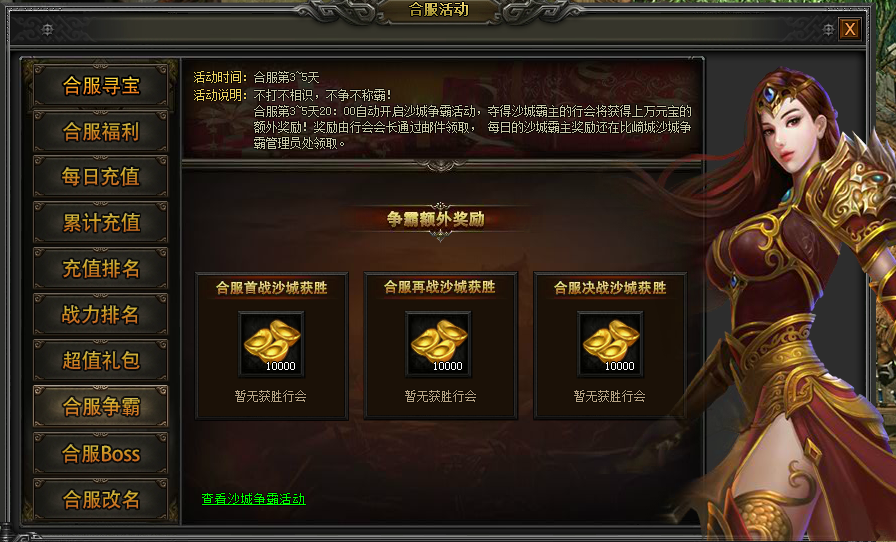 【活动内容】:合服后第3~5天20:00自动开启沙城争霸活动,夺得沙城霸主的行会会长将获得10000元宝的额外奖励,额外奖励由会长通过邮件领取,每日的沙城霸主奖励依旧在比崎城NPC沙城争霸管理员处领取!