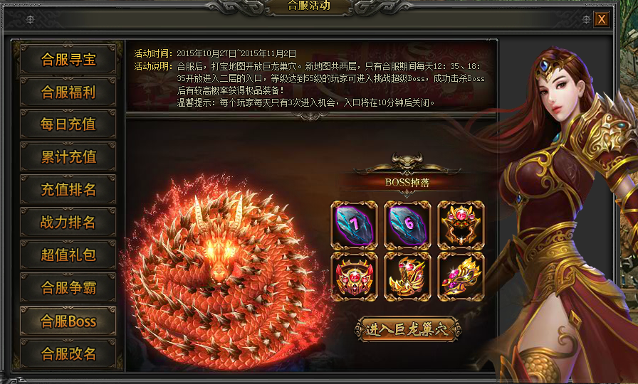 【活动内容】:合服后,打包地图开放巨龙巢穴,新地图共两层,只有合服期间每天12:35、18:35开放二层入口,等级达到55级的玩家可进入挑战超级BOSS,成功击杀BOSS后有较高概率获得100级东皇等极品装备!
