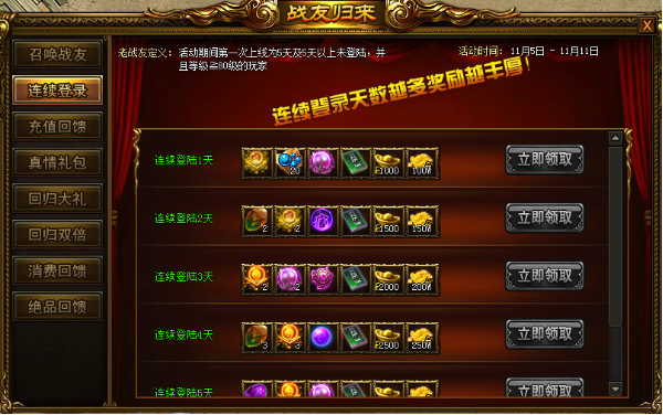 活动内容:活动期间,老战友连续登陆天数达到1、2、3、4、5天时均可领取丰厚奖励!