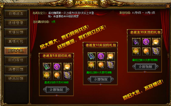活动内容:活动期间,离线天数达到5天、10天、30天老战友上线后可分别领取丰厚的礼包一份。