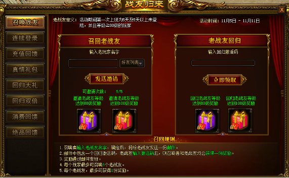 活动内容:召唤者可输入老战友名字,确定后系统将给老战友发送一份召回邮件,邮件中包含一个回归激活码,老战友在本界面输入激活码后召唤者和老战友均可领取丰厚的奖励1份!每个玩家最多可召唤5个老战友