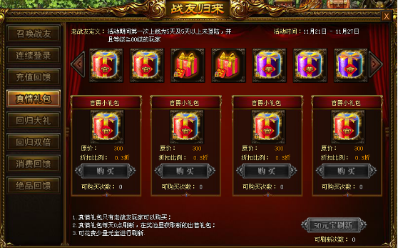 活动内容:活动期间老战友可购买各种超低折扣礼包,奖池中可刷新出不同的出售礼包,每天0点重置出售礼包。