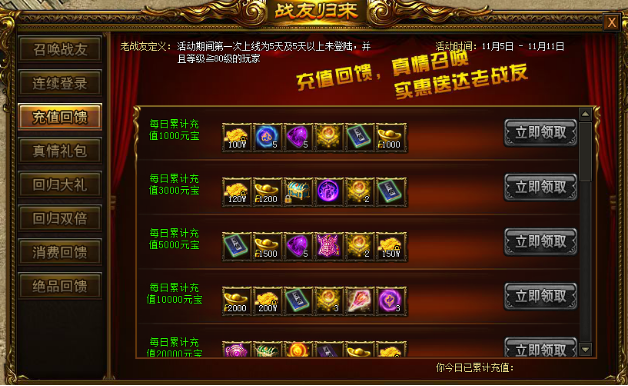 活动内容:活动期间,老战友每日充值累计达到1000、3000、5000、10000、20000、50000元宝时即可分别领取丰厚的奖励!