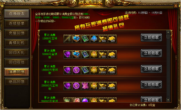 活动内容:活动期间,累计消费金额分别达到1000、5000、10000、30000、50000、100000、2000000、500000元宝时可分别领取一份相应的奖励!(本活动不仅限于老玩家可参与,所有玩家均可参与)
