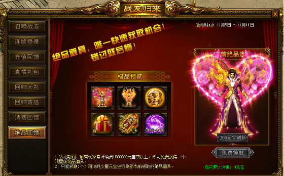 活动内容:活动期间,累计消费1000000元宝以上,即可免费获得1个限量绝版道具,道具只能获取1个,可消耗少量元宝进行刷新当前领取的绝品道具(本活动不仅限于老玩家可参与,所有玩家均可参与)