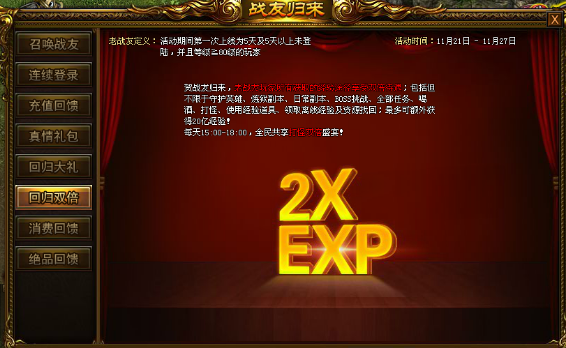 活动内容:活动期间,老战友玩家所有获得的经验途径享受双倍待遇,包括但不限于守护英雄、炼狱副本、日常副本、BOSS挑战、全部任务、喝酒、打怪、使用经验道具、领取离线经验及资源找回,最多可额外获得20亿经。