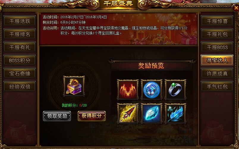 活动内容:活动期间,在天龙宝藏中寻宝获得地炎魔晶、璞玉和特戒结晶可分别获得1/1/2点积分,每20点积分可兑换1个寻宝回馈礼盒,礼盒中有几率开出幻化羽翼及复活幻灵!