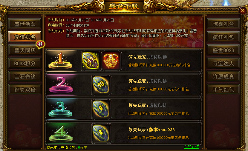 活动内容:活动期间,每天充值一定数量元宝,即可领取豪华大礼!