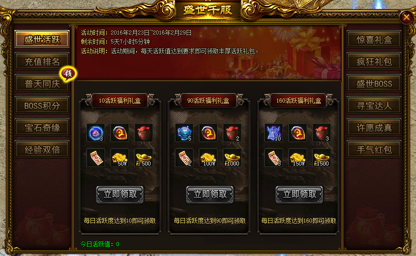 活动内容:活动期间,每天活跃值达到10、90、160时可分别领取丰厚奖励一份!