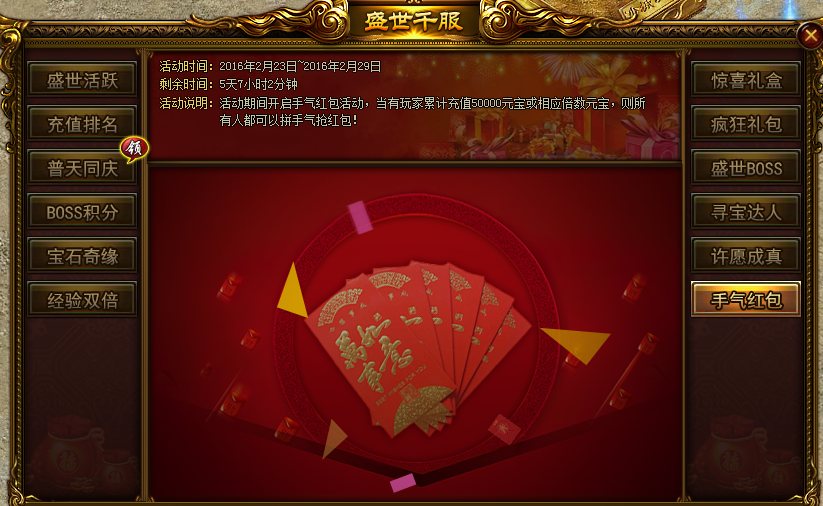 活动内容:活动期间开启手气红包活动,当有玩家累计充值50000元宝或相应倍数元宝,则所有人可以拼手气抢红包!