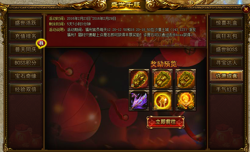 活动内容:活动期间,每天12:20-12:50和18:20-18:50在沙漠土城(143,123)出福利官员派发福利!只要献上许愿石即可获得丰厚奖励,许愿石可通过击杀BOSS获得。