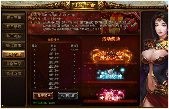 活动说明:活动期间,增加幻装、幻武和幻羽的衣橱经验可获得相应的装扮值。装扮值达到20000即可获得时尚男神(女神)30天时效称号,并且参与排名。活动结束后,排名第一的玩家可获得邮件发送的绝版称号“舞会之王”!!!