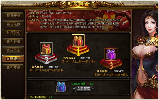 活动说明:活动期间,击杀boss与精英怪可获得boss积分。每天boss积分达到200即可领取boss积分礼包;累计boss前3的玩家在活动结束时刻获得相应的排名豪礼!