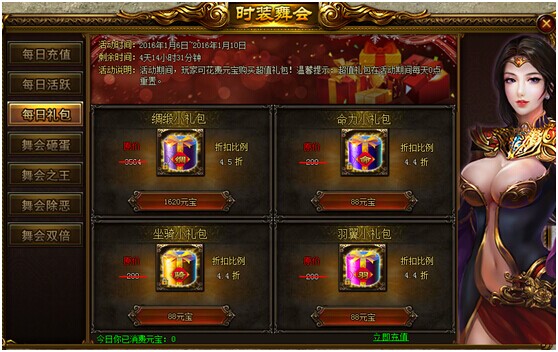 活动说明:活动期间,玩家可花费元宝购买超值礼包!(每日0点重置礼包)