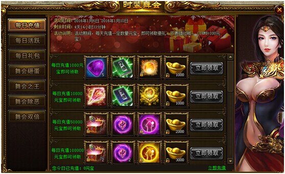 活动说明:活动期间,每天充值一定数量元宝,即可领取豪礼,不要错过哟!