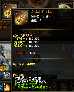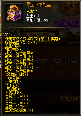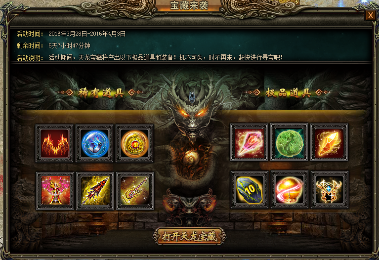 活动内容:活动期间,天龙宝藏将产出噬骨恶魔(幻羽)、龙魂吉他(幻武)、重生幻灵、凌风金护乾坤镜以及战天传奇套装等极品装备,快来寻宝吧!