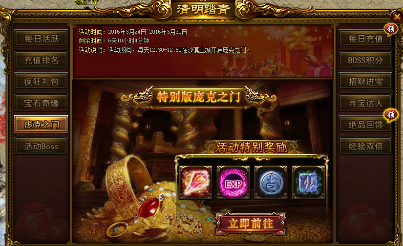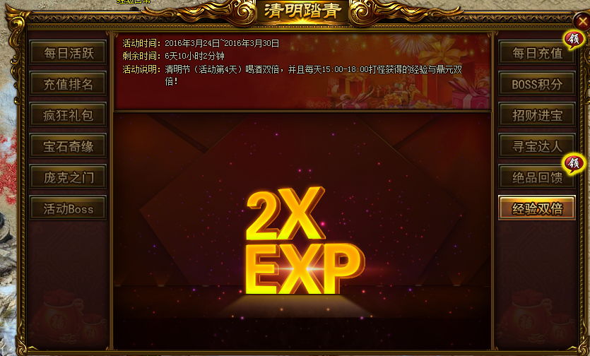 活动内容:清明节当天(4号)喝酒双倍,并且每天15:00-18:00打怪获得的经验与鼎元双倍!