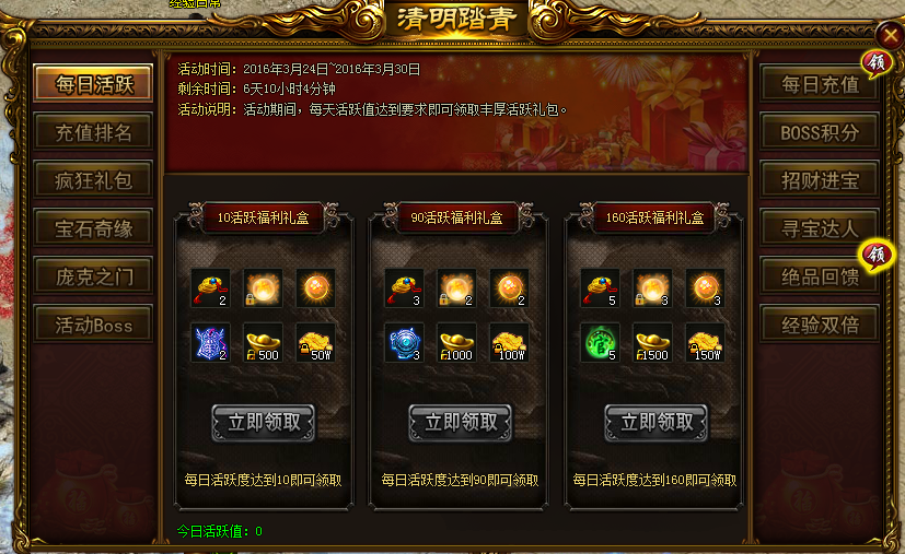 活动内容:活动期间,每天活跃值达到要求即可领取丰厚活跃礼包。