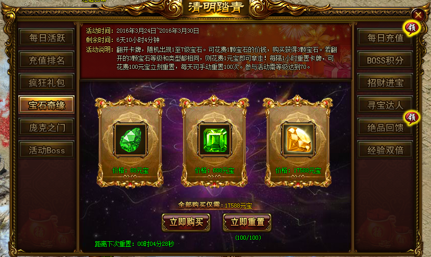 活动内容:翻开卡牌,随机出现1至7级宝石,可花费1颗宝石的价钱购买获得3颗宝石,若翻开的3个宝石等级和类型都相同,则花费1元宝即可拿走。