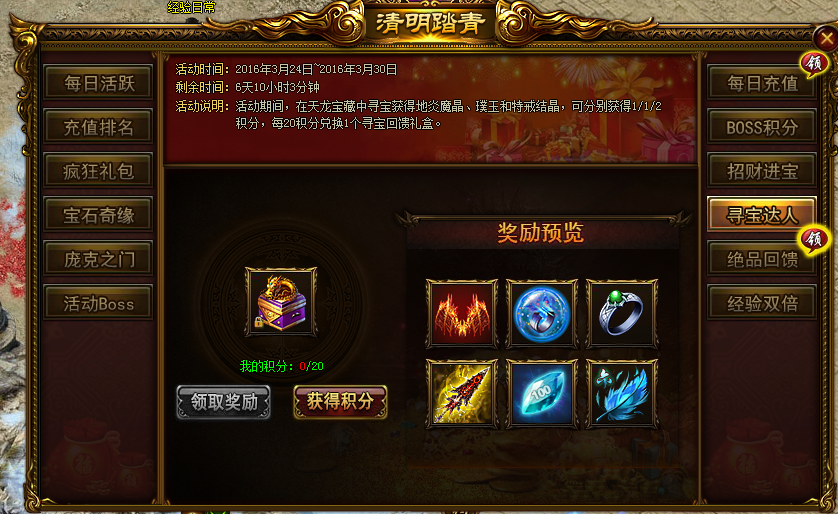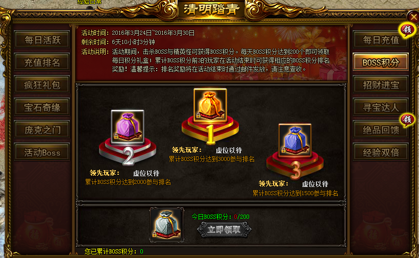 活动内容:活动期间,击杀bOSS与精英怪获得BOSS积分,每天BOSS积分达到200个即可领取每日积分礼盒,累计BOSS积分前3的玩家在活动结束时可获得相应的BOSS积分排名和奖励!