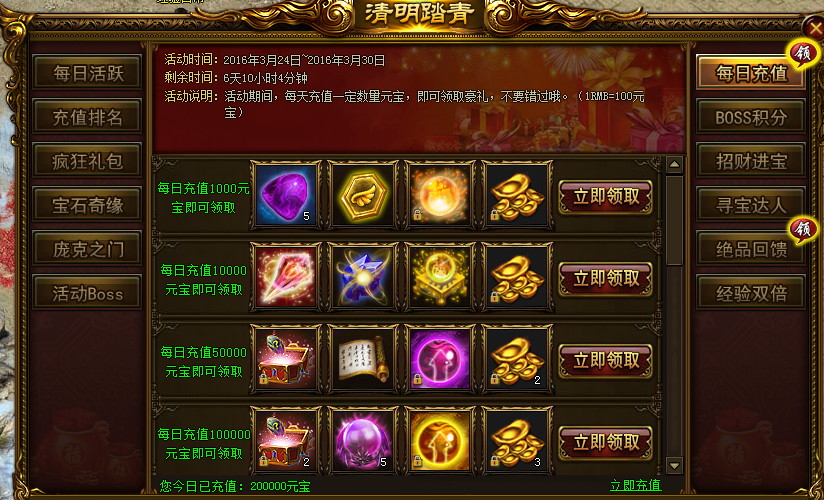 活动内容:活动期间,每天充值一定数量元宝,即可获得丰厚奖励,更有魂器值卷轴、天赋卷轴、坐骑装备升级礼盒等首次亮相物品!还在等什么?
