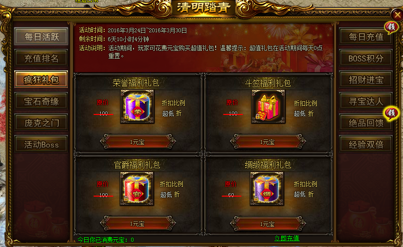 活动内容:活动期间,玩家可花费元宝购买超值礼包!每天0点重置!